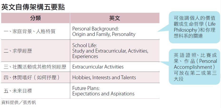 張秀帆指出,英文寫作要言之有物,平時就要多閱讀時事新聞,並練習用英文表達看法。至於備審資料的英文自傳寫作,基本架構不外乎:家庭背景及人格特質、求學經歷、社團活動或其他經歷、休閒嗜好、未來目標等五大要素。